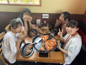 午前中に頑張って英語の勉強をした後、学校の近くのShakey’sというピザ屋さんにて、Farewell Partyを開いていただきました。各テーブルには、様々な種類のピザ、ポテト、チキンがズラリ。好みのピザを選んで食べられて、生徒たちは大満足の様子でした。